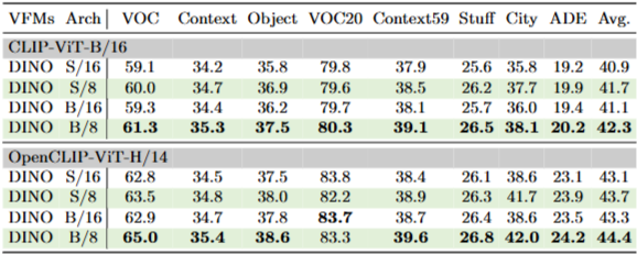 - 예: CLIP ViT-B/16은 패치 크기 16을 사용해 더 낮은 해상도를 생성하지만, VFM(DINO ViT-B/8)은 패치 크기 8을 사용해 더 높은 해상도를 생성.