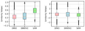 - 예를 들어, Fig. 4의 왼쪽 그래프에서 DINO의 코사인 유사도의 중앙값은 0.22인데 반해, SAM의 중앙값은 0.57로 더 높음.